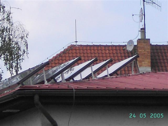 boční pohled na kolektory Heliostar umístěné ne plechové střeše