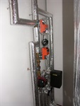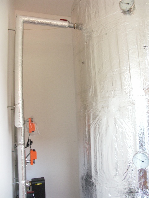 pohled na část technologie u akumulační nádrže, nádrž se dokáže průběžně ohřívat a zároveň odevzdává i teplo do domu v případě potřeby